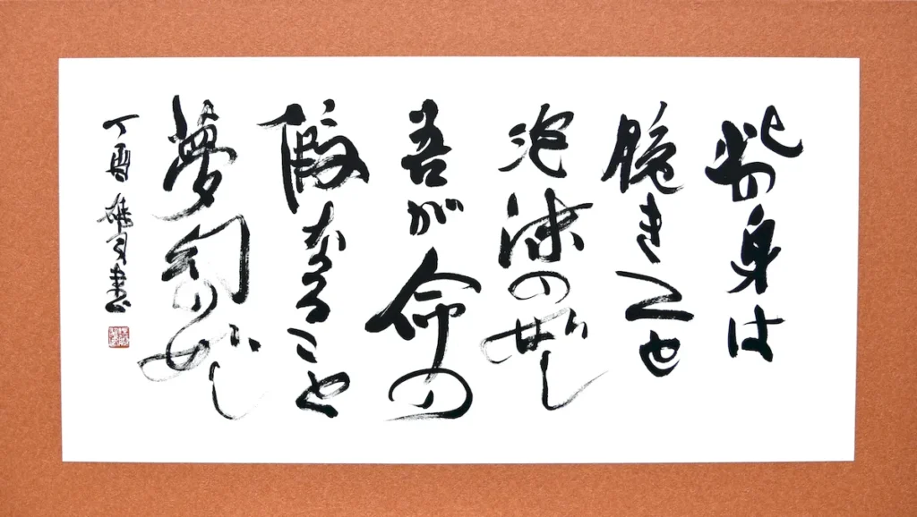 我が身のもろくはかないことは、あたかも水上の泡のようであり、また我が命も夢幻のように仮有なるものである。
